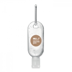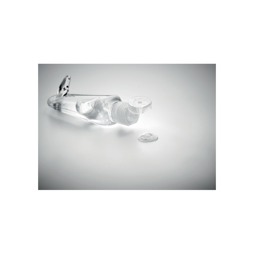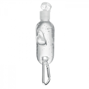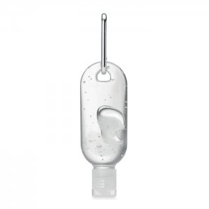 Artikel-Nr: OCBMO6130-22Handreinigungsgel in nachfüllbarer PET Flasche mit Klappdeckel und Karabiner. Füllmenge: 30 ml.
