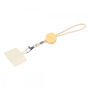 Artikel-Nr: AND734238Handyhalter mit Handschlaufe aus Baumwolle, rundem Bambuselement, Handyeinleger und Metall-Karabiner.