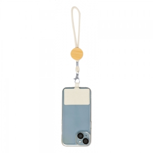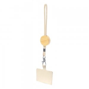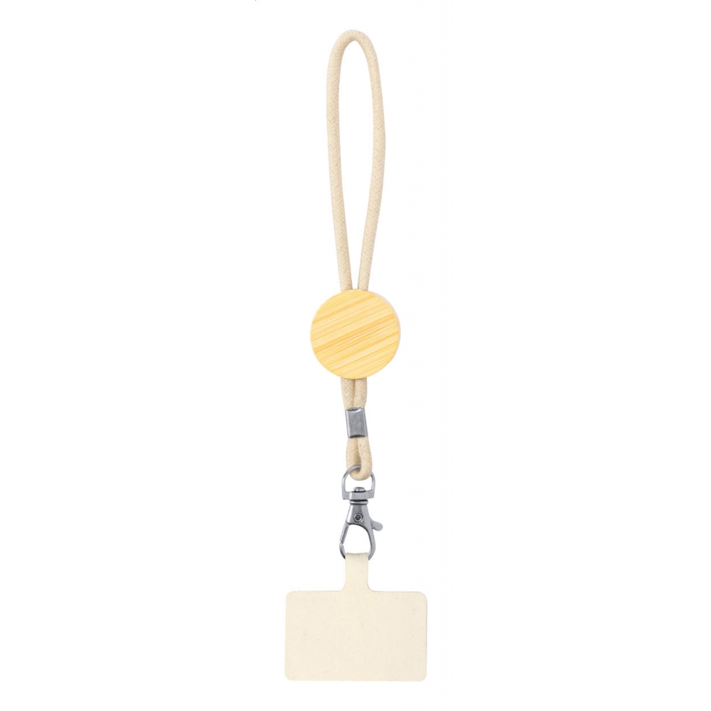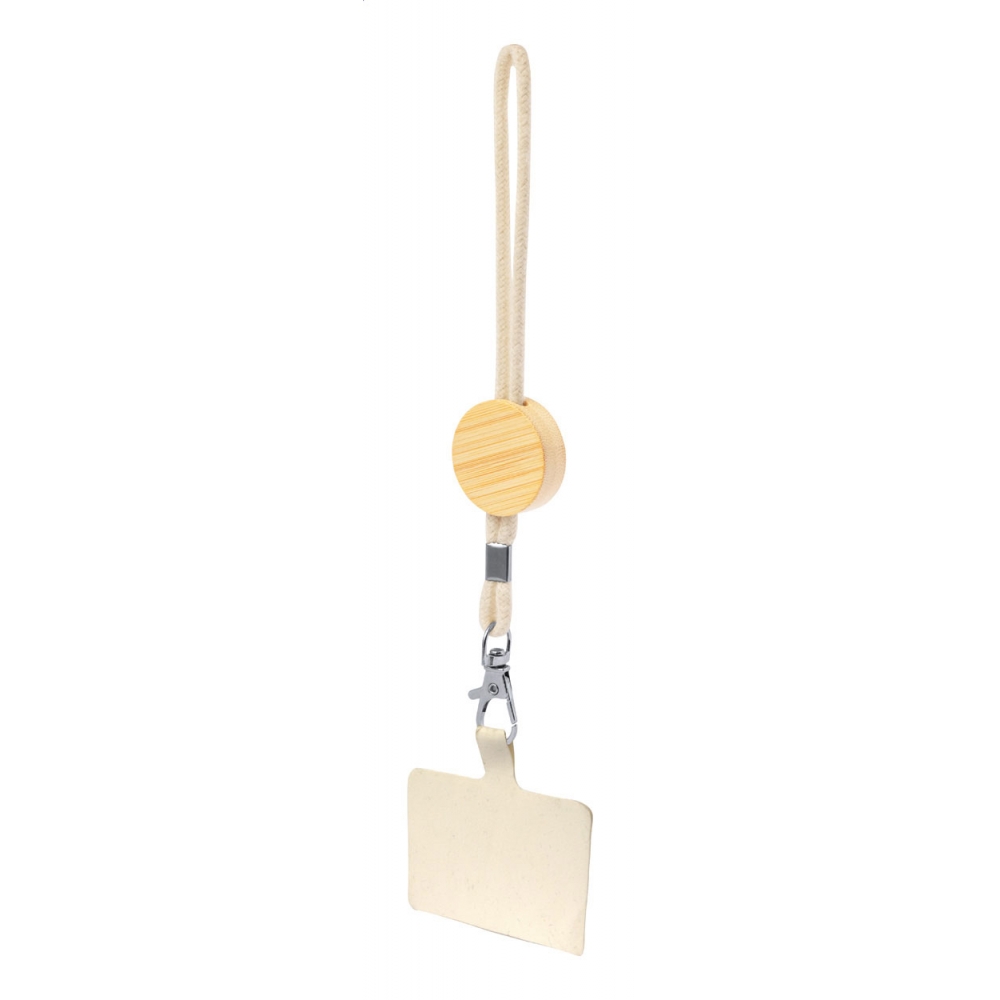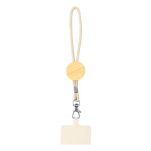 Artikel-Nr: AND734238Handyhalter mit Handschlaufe aus Baumwolle, rundem Bambuselement, Handyeinleger und Metall-Karabiner.