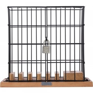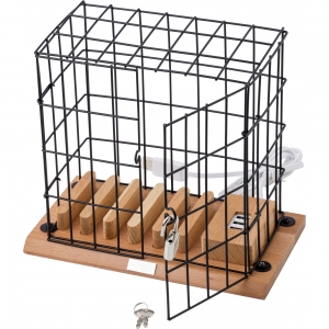 Artikel-Nr: GIV9222001Handyhalter-Käfig aus Aluminium und Holz mit USB-Port und einem Schloss mit zwei kleinen Schlüsseln.