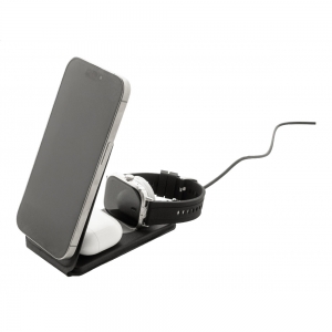 Artikel-Nr: AND864120-10Hochwertige, faltbare Handyhalterung und kabelloses Ladegerät aus recyceltem PU-Leder. Mit magnetischem kabellosem Schnellladegerät (15 W), kabellosem Ladegerät (5 W) für Kopfhörer (nur Apple®) und kabellosem Ladegerät (2,5 W) für Smartwatches (Apple® und Samsung®). Inklusive selbstklebendem Metallring, um die Magnetfunktion auf jedem kabellos ladbaren Gerät zu nutzen. Kompatibel mit iPhone® 12 oder neuer. Inklusive USB-Ladekabel.