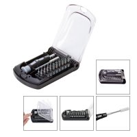 Artikel-Nr: 57383540SW-GRBit-Set mit 20 Bits, Schraubendreher und Verlängerung. Ideal für alle filigranen Feinarbeiten an Uhr, Brille, PC usw. Die Feinbits für präzises Arbeiten sind aus CRV-Stahl 8660 Rockwell 54° gefertigt:4x Phillips (PH000 / PH00 / PH0 / PH1), 5x Schlitz(1,0 / 1,5 / 2,0 / 2,5 / 3,0 mm), 5x Torx (T4 / T5 / T6 / T7 / T8), 6x Nüsse (2,5 / 3,0 / 3,5 / 4,0 / 4,5 / 5,0). Jedem Bitprofil ist eine Farbe zugeordnet. Das intelligente Farbleitsystem erleichtert die Suche nach dem passenden Bit. Im Set enthalten ist eine 70 mm Verlängerung. Alle Teile sind in einer hochwertigen Kunststoffbox untergebracht. Durch das Betätigen des Verschlusses öffnet sich die Box, der Bithalter stellt sich automatisch auf und ermöglicht so ein leichtes Entnehmen der Bits.