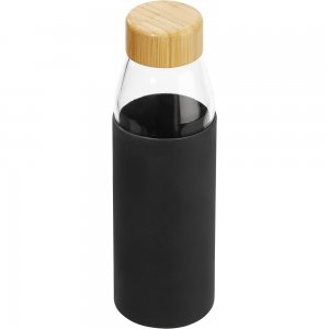 Hitzebeständige Glas-Trinkflasche 0,5 l mit Bambusdeckel, Silikonmanschette und Geschenkbox