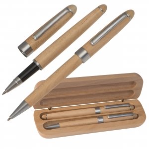 Artikel-Nr: EAG061401Holz Schreibset aus Ahorn bestehend aus einem Drehkugelschreiber mit blauschreibender Metallsystemmine und einem blauschreibenden Rollerball in einem Etui. Ihre Werbung lasern wir auf beide Schreibgeräte.