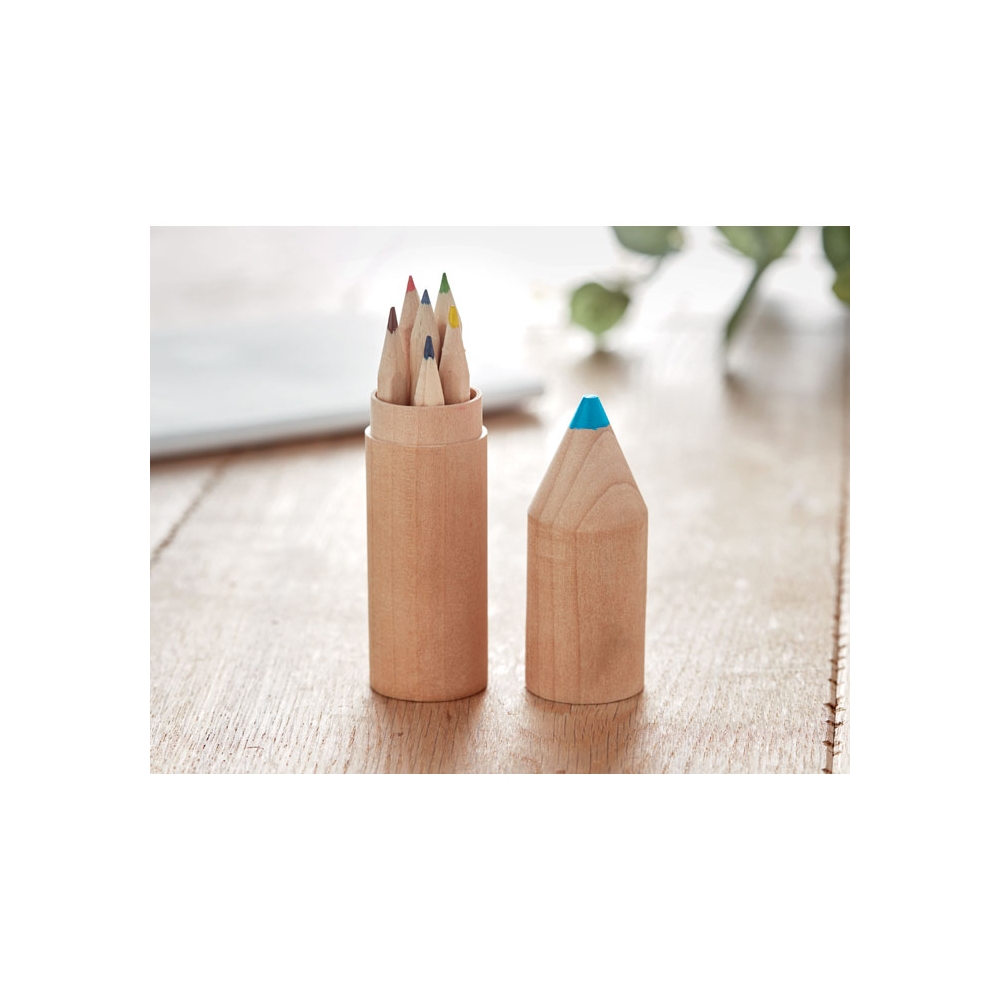 Artikel-Nr: OCBMO9875-406 Buntstifte in einer runden Box aus Holz in Form eines Stiftes.
