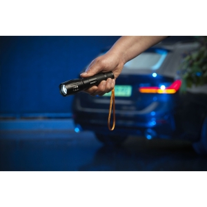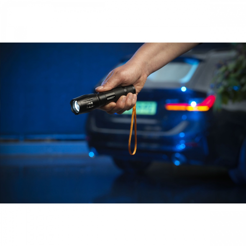 Artikel-Nr: CLP278298Kompakte, leichte Aluminium-Taschenlampe der Marke Homey's. Mit T6 LED (200 Lumen). Diese vielseitige Lampe verfügt über ein Blitzlicht, eine SOS-Funktion und eine Zoomfunktion in drei Einstellungen. Zoomen Sie hinein, um einen konzentrierten Lichtstrahl auf bestimmte Bereiche zu richten, oder heraus, um einen größeren Beleuchtungsbereich zu erreichen. Maximale Nutzungsdauer 3,5 Stunden. Reichweite 150 Meter. Wasserfest (IP55). Geeignet für Heimwerker, Outdoor-Aktivitäten und Notfälle. Inklusive Handschlaufe und Batterien. Verpackt pro Stück.