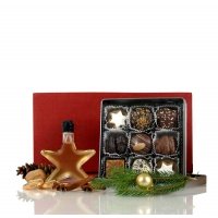 Artikel-Nr: A276K00965... weihnachtliches Set bestehend aus einer edlen Metalldose 220g. mit feinstem Honigkuchen Gebäck in Kombination mit einer sandgestrahlten Schmuckflasche in Sternform 0,1 Ltr., befüllt mit köstlichem Weihnachtslikör 20 % vol. Verpackt in einer attraktiven Präsentkartonage mit Sizzle Pak und z.B. nachhaltiger Veredelung der Schmuckflasche mit Ihrem Logo, ein stilvolles Präsent für Kunden, Freunde und Geschäftspartner.