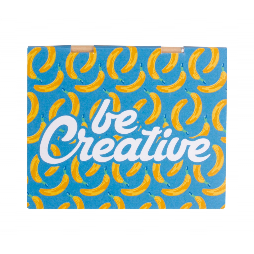 Artikel-Nr: AND716600Individueller, mit Papier überzogener Haftnotizblock mit Mini-Holzstift. Enthält Haftnotizen aus Recyclingpapier in 2 Größen (50 Blatt à 100 x 75 mm, 25 Blatt à 50 x 75 mm) und 100 Seitenmarkierer aus Kunststofffolie in 5 verschiedenen Farben (12 x 44 mm). Der Preis ist inklusive vollfarbig bedruckter Außenhülle. Mindestmenge: 100 Stk.