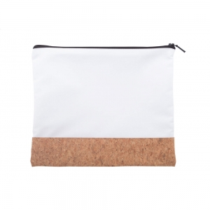 Individuelle Reißverschluss-Kosmetiktasche aus Polyester und natürlichem Kork. Der Preis ist inkl. All-Over-Sublimationsdruck. Mindestmenge: 50 Stk.