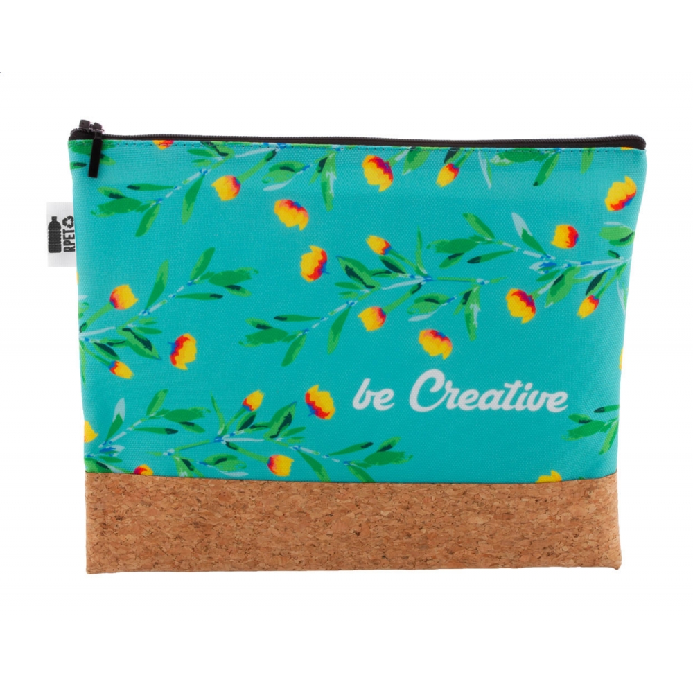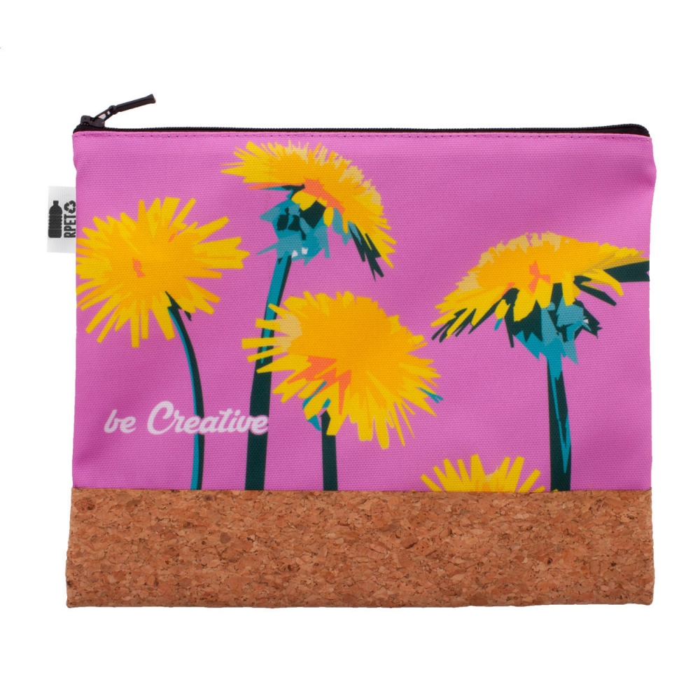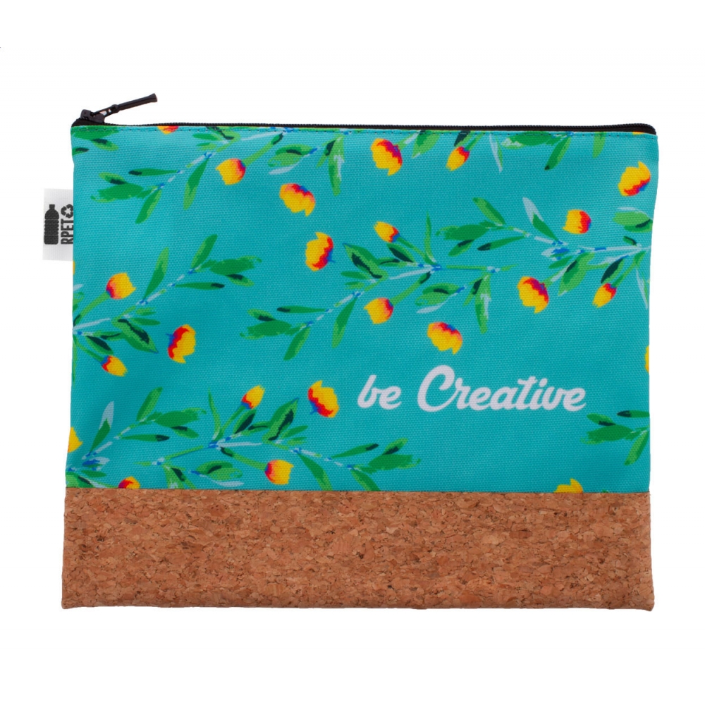 Artikel-Nr: AND716589-10Individuelle Reißverschluss-Kosmetiktasche aus 600D RPET Polyester und natürlichem Kork mit vollflächigem Sublimationsdruck. Mindstmenge: 50 Stk.