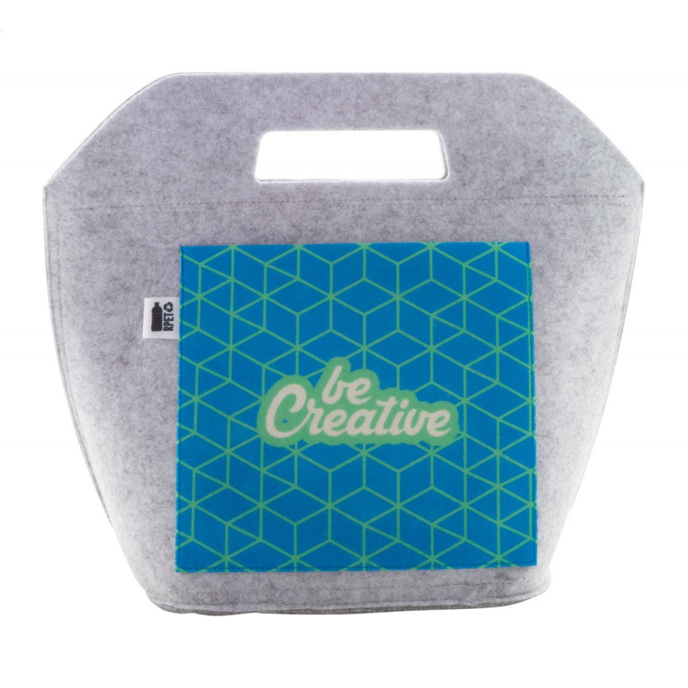 Artikel-Nr: AND716769Individuelle RPET-Filz-Kühltasche mit Reißverschluss, Aluminiumpolsterung und vollfarbig bedruckter Vordertasche. Mit gestanzten Griffen. Mit RPET-Label. Der Preis beinhaltet den Sublimationsdruck. Mindestmenge: 25 Stk.