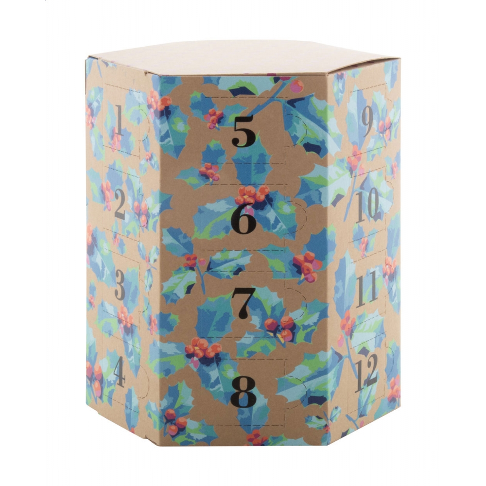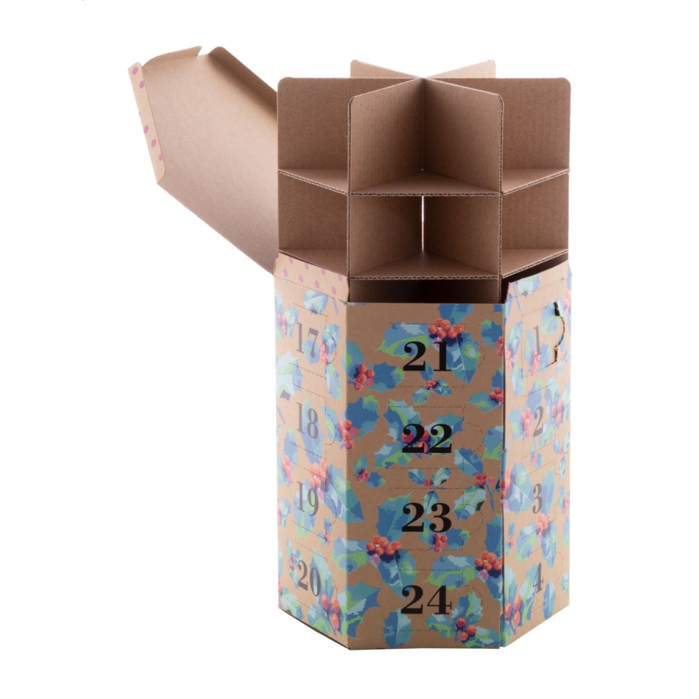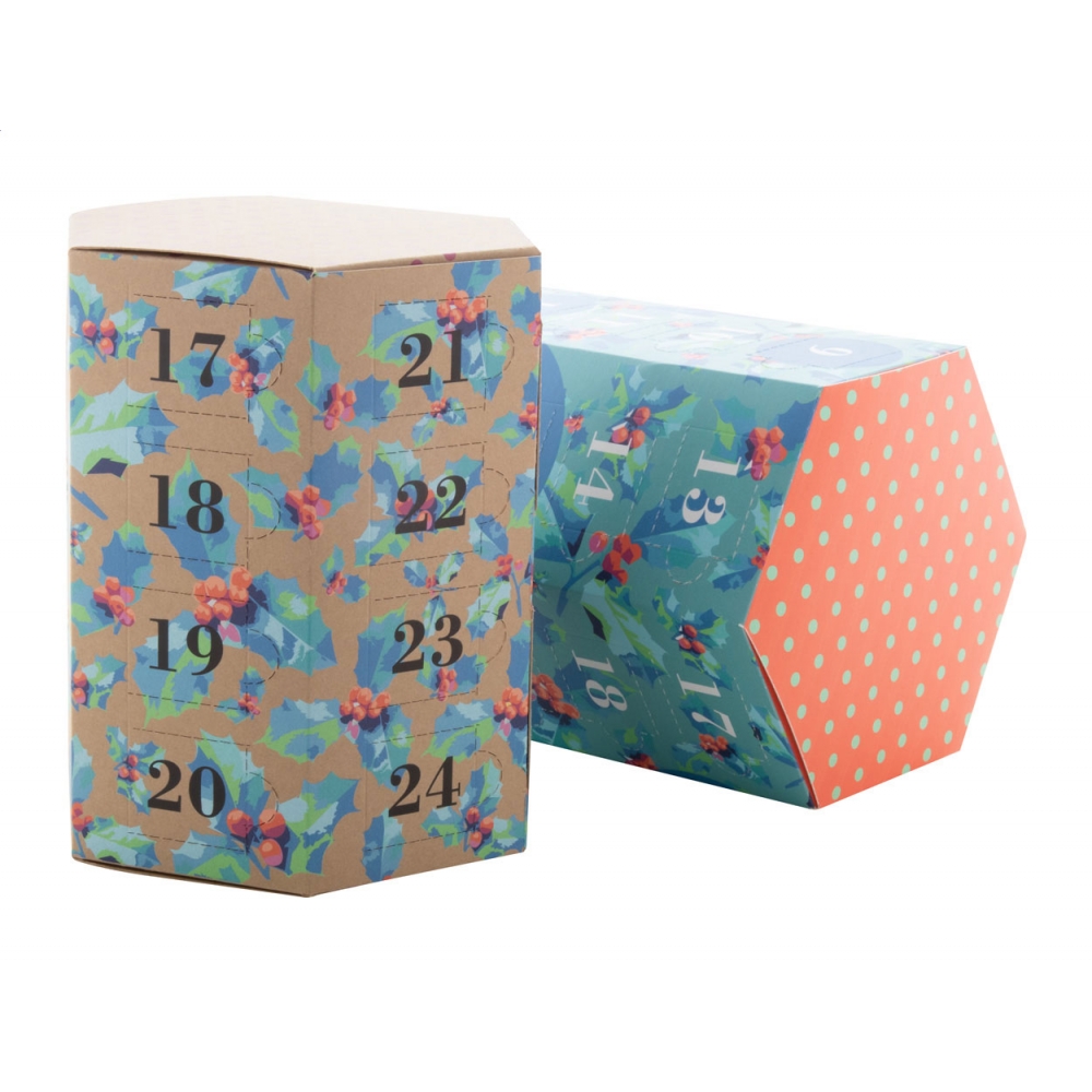 Artikel-Nr: AND716496Individueller vollfarbig bedruckter sechseckiger Adventskalender aus Krafpapier mit 24 Fächern, ohne Inhalt. Die Lieferung erfolgt flach verpackt. Mindestbestellmenge: 50 Stk.