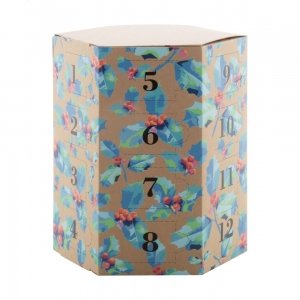 Artikel-Nr: AND716496Individueller vollfarbig bedruckter sechseckiger Adventskalender aus Krafpapier mit 24 Fächern, ohne Inhalt. Die Lieferung erfolgt flach verpackt. Mindestbestellmenge: 50 Stk.
