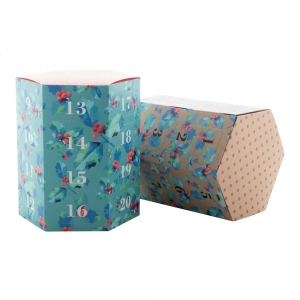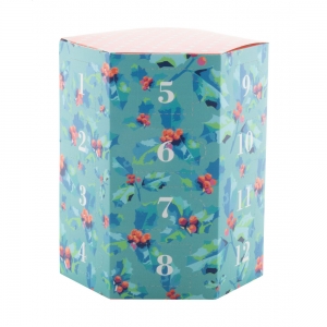 Artikel-Nr: AND716506Individueller vollfarbig bedruckter sechseckiger Adventskalender aus Pappe mit 24 Fächern, ohne Inhalt. Die Lieferung erfolgt flach verpackt. Mindestmenge: 50 Stk.