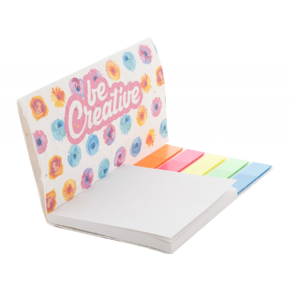 Artikel-Nr: AND716906Maßgefertigter Zettelspender aus Samenpapier mit vertikaler Kopfzeile. Enthält 50 Blatt Haftnotizen aus Recyclingpapier (75×75 mm) und 100 Seitenmarker aus Kunststofffolie in 5 verschiedenen Farben (44×12 mm). Im Preis inbegriffen ist der Vollfarbdruck auf der Kopfzeile. Mindestbestellmenge: 100 Stück. Mit verschiedenen Wildblumensamen.