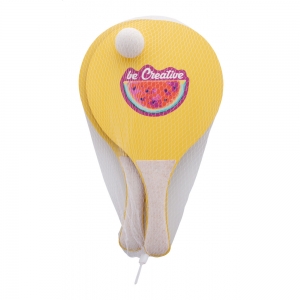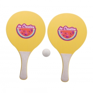 Artikel-Nr: AND716639Individuelles Strandtennisset mit 2 Schlägern und einem Ball. Material: Birkensperrholz und ökologischer Weizenstrohkunststoff. Der Preis ist inkl. identischem Vollfarbdruck auf der Vorderseite beider Schläger. Mindestmenge: 50 Stk.