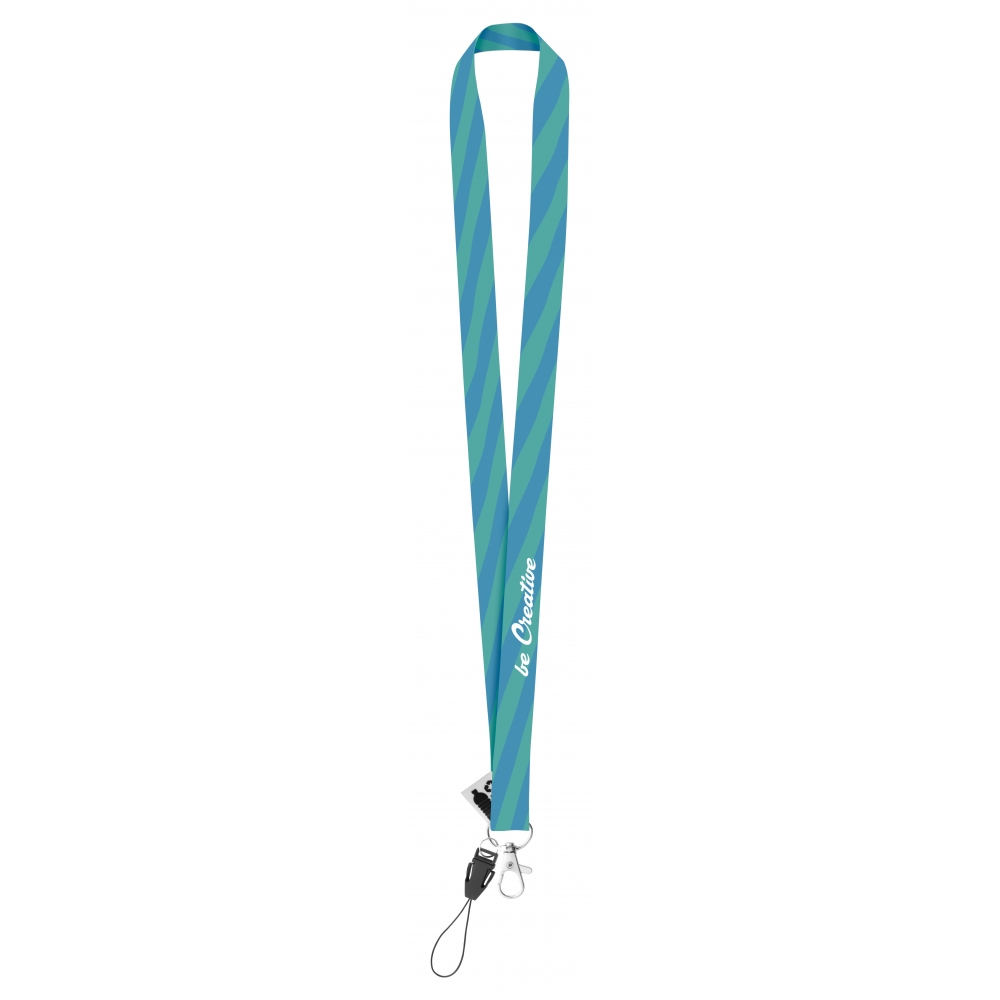 Artikel-Nr: AND718959Individuelles Lanyard aus RPET mit Metallkarabiner und Handyfaden. Der Preis ist inkl. Sublimationsdruck auf beiden Seiten. Mindestmenge: 100 Stk.