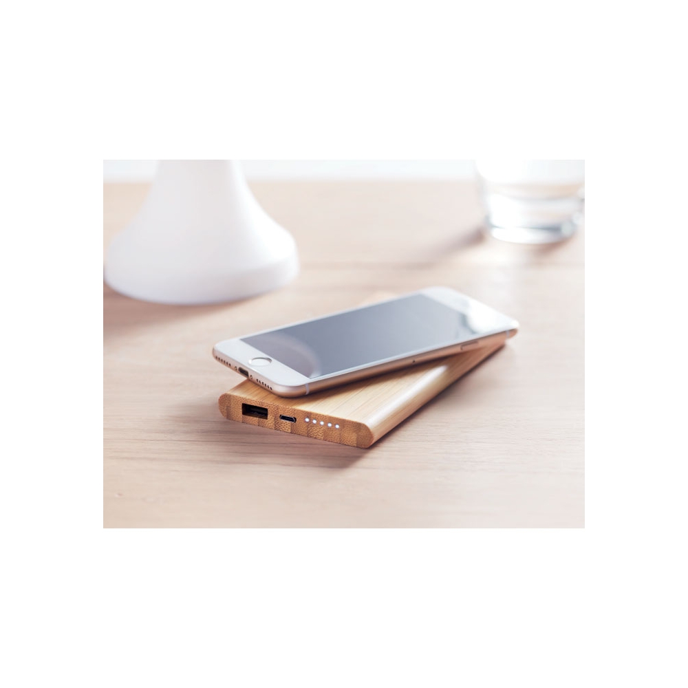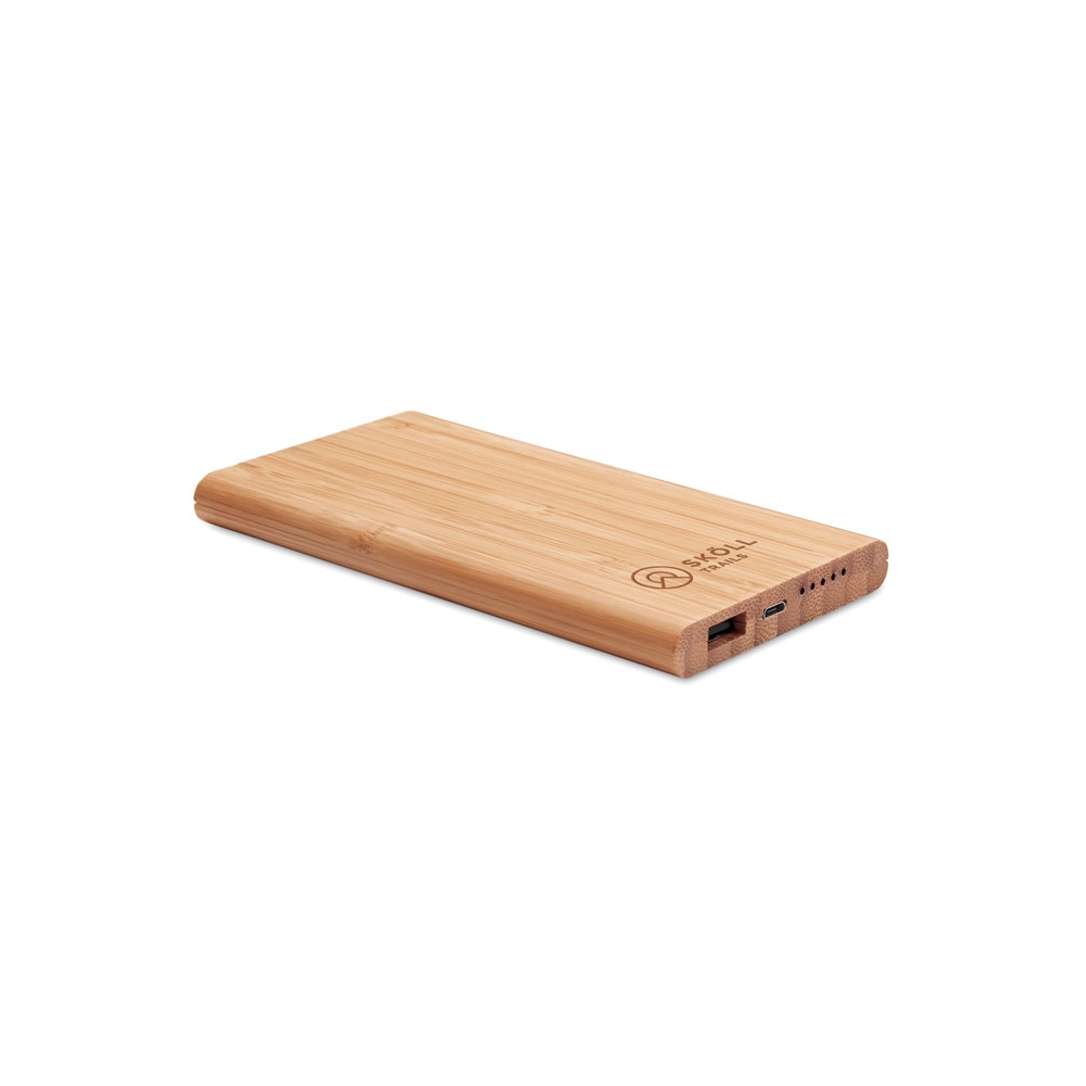 Artikel-Nr: OCBMO9662-406000 mAh Powerbank mit induktiver Ladestation. Bambusgehäuse. Inkl. Typ- C-Adapter. Ausgangsstrom Powerbank DC9V/1.66A (15W). Kabelloser Ausgangsstrom: DC9V/1.66A (5W). Bambus ist ein natürliches Produkt, es kann daher zu leichten Abweichungen in Farbe,