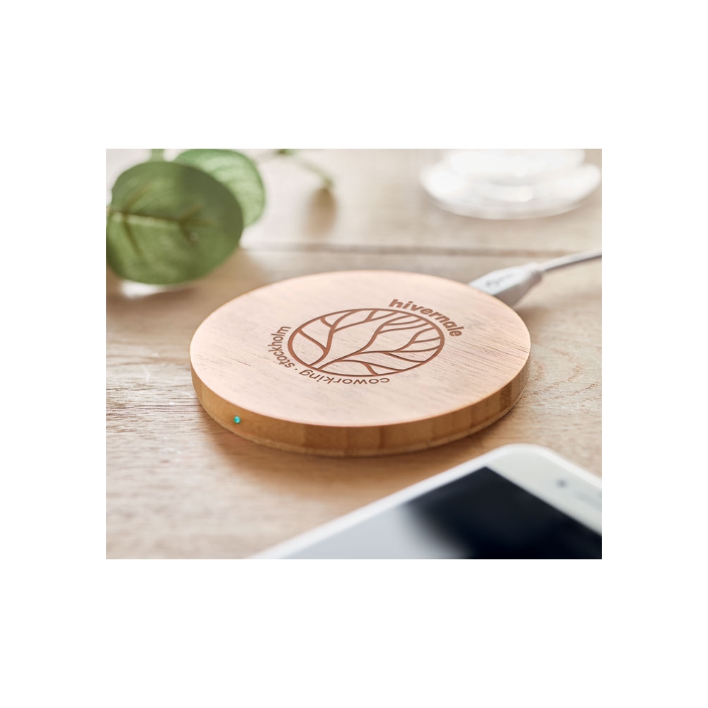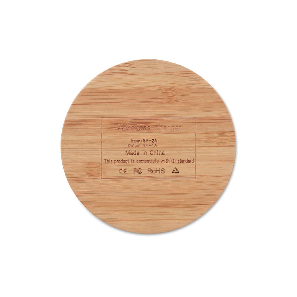 Artikel-Nr: OCBMO9434-40Induktives Ladegerät mit Bambus. Verbinden Sie das Gerät mit dem Computer und laden Sie Ihr Smartphone durch einfaches Auflegen auf. Blaue Ladeanzeige. Ausgang: DC5V/1A (5W). Bambus ist ein natürliches Produkt, es kann daher zu leichten Abweichungen in