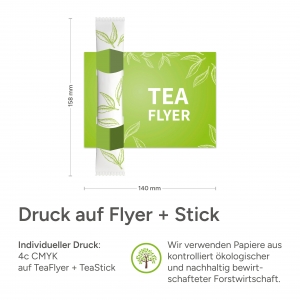 Artikel-Nr: SAN40-400-001-01mit für 1 TeaStick (Individuelles Design). Der, für Material: Karton mit seidenmattem Glanz aus kontrolliert ökologischer und nachhaltig bewirtschafteter Forstwirtschaft. Druck auf Vorder- und Rückseite: 4c (CMYK). Inklusive 1 Bio TeaStick (konfektionierte Lieferung): • hergestellt aus Pflanzenfasern und Stärke • ohne Gentechnik • vegan • nicht erdölbasiert • zu 100% aus nachwachsenden und natürlichen Rohstoffen • Stick biologisch abbaubar (kompostierbar) • Aromaverpackung aus Papier Der innovative TeaStick ist purer Genuss und dabei noch sehr praktisch. Stick direkt in die Tasse mit heißem Wasser geben, ziehen lassen, fertig! Durch die Perforation zirkuliert das Wasser, das Vlies hält Brösel sicher zurück. Auswahl aus vielen Sorten. BIO Kontrollstelle DE-ÖKO-039. Druck: 4c (CMYK) auf Aromaschutzverpackung aus Papier (Entsorgung im