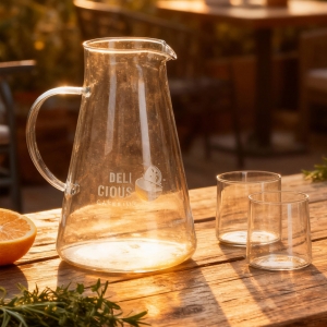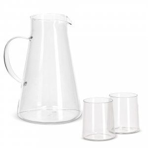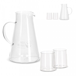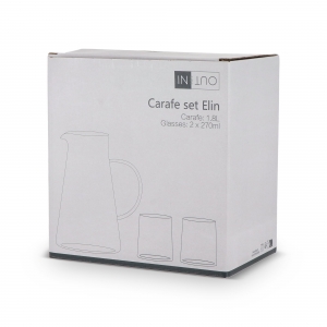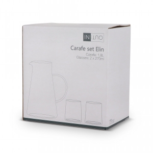 Artikel-Nr: ART57008N0004Das InSideOut Karaffenset Elin besteht aus 2 Gläsern und einer Karaffe mit Henkel. Das Set ist aus Borosilikat, einem hitzebeständigen und sehr starken Glas, hergestellt. Das Design ist einfach, aber stilvoll, ohne Schnörkel oder zusätzliche Kanten und daher perfekt mit anderem Geschirr zu kombinieren. Die Kanne hat ein Fassungsvermögen von 1,2 l, die Gläser fassen 270 ml und sind mikrowellengeeignet. Sowohl der Krug als auch die Gläser können mit einer Gravur versehen werden.