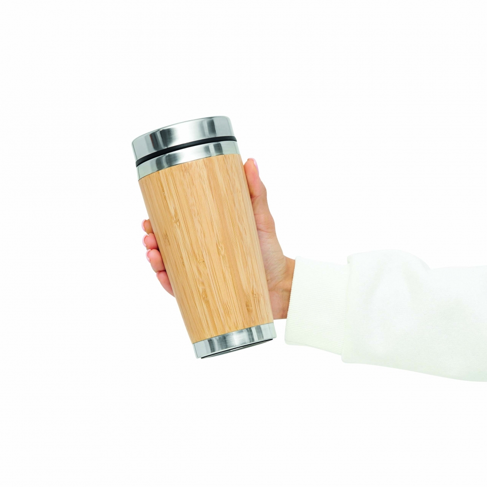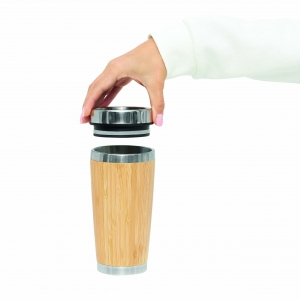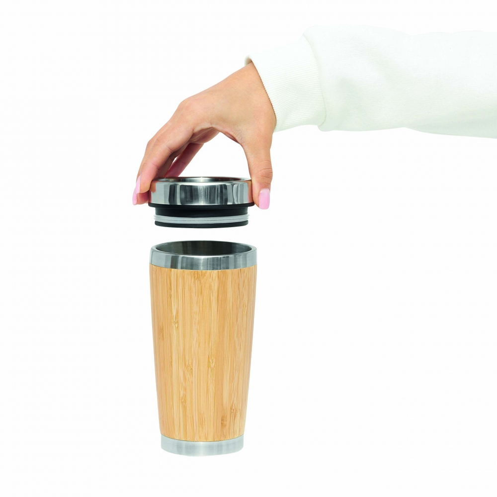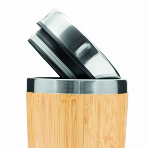 Artikel-Nr: INP56-0304571Isolierbecher BAMBOO DRINK, doppelwandig: aus Edelstahl, mit Bambus-Ummantelung, Deckel mit Silikondichtung und integrierter Trinköffnung, beschichteter Boden für gute Oberflächenhaftung, Füllmenge ca. 450 ml