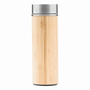 Vakuum-Isolierbecher BAMBOO GO, doppelwandig: innen und außen aus Edelstahl, mit Bambus-Ummantelung, Deckel mit sicherem Schraubverschluss und Silikondichtung, mit herausnehmbarem Teesieb, Füllmenge ca. 350 ml