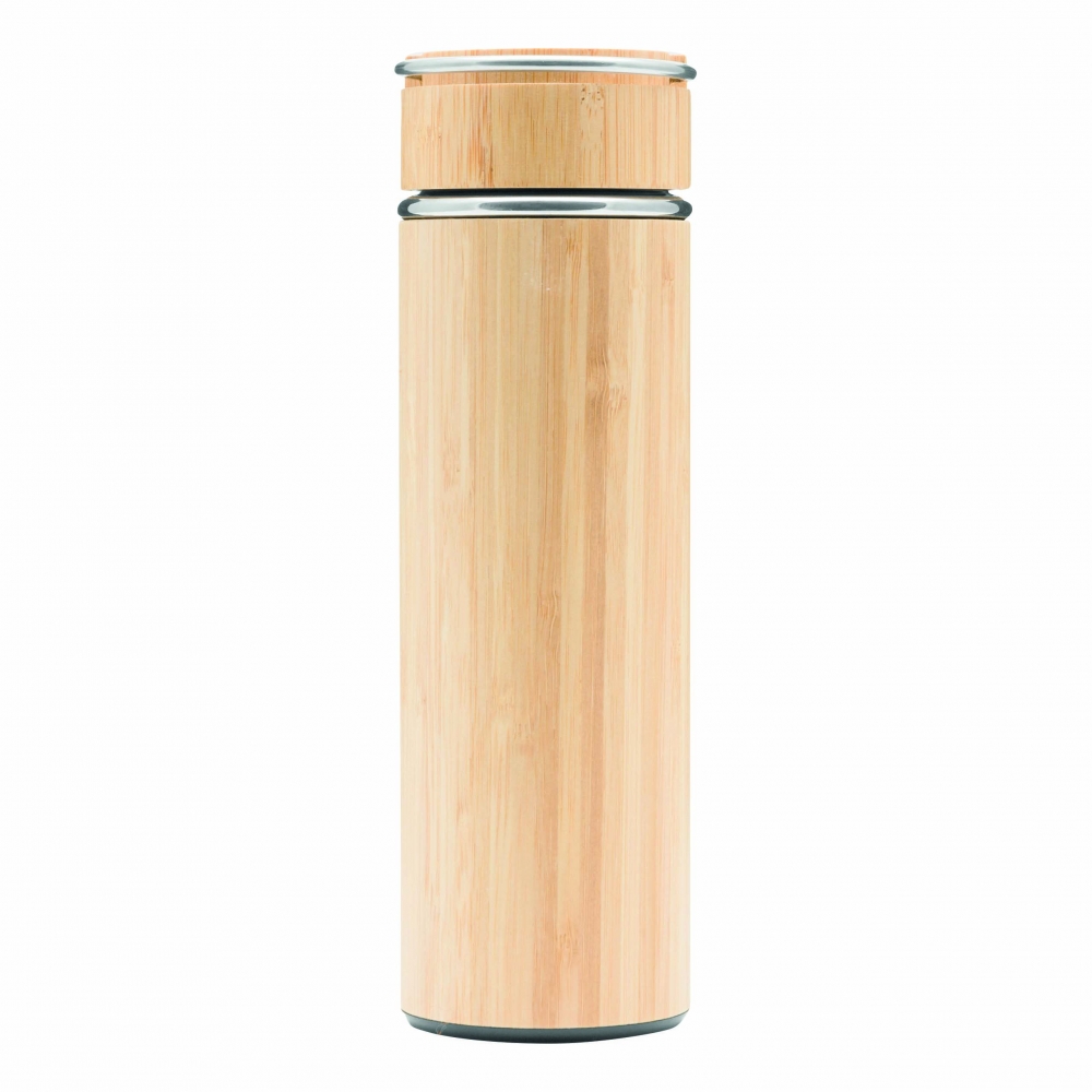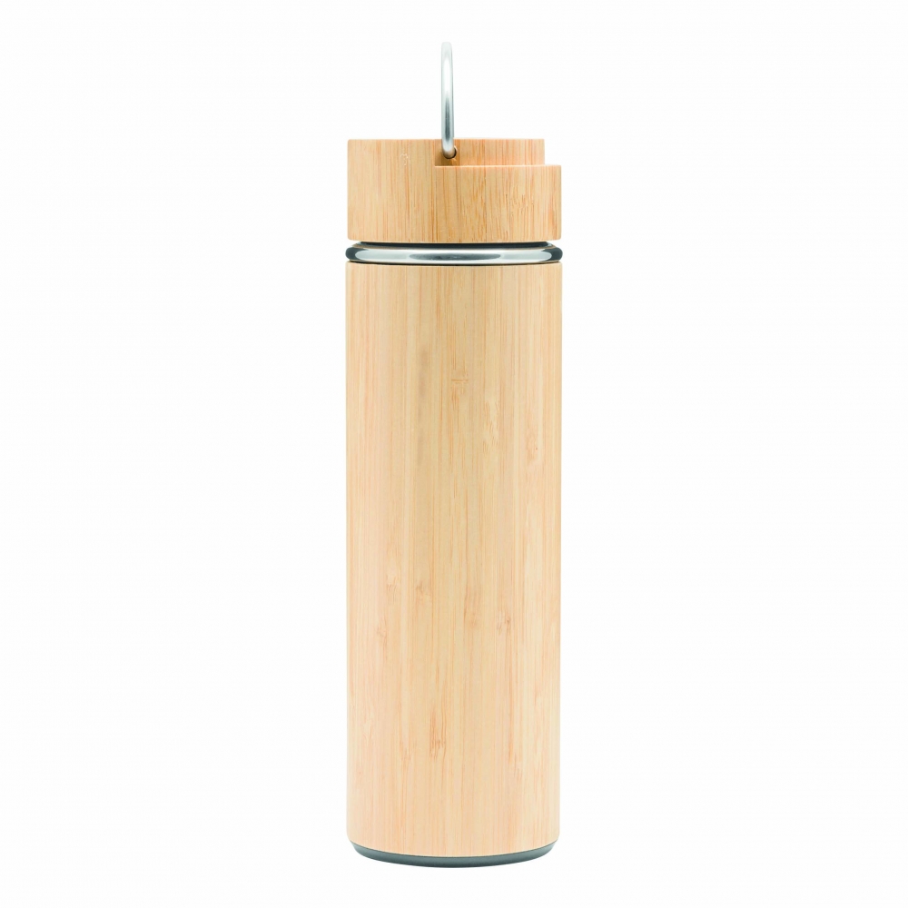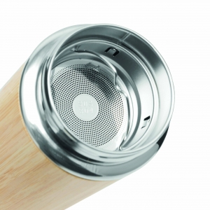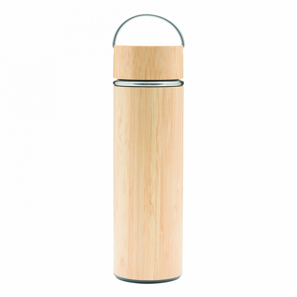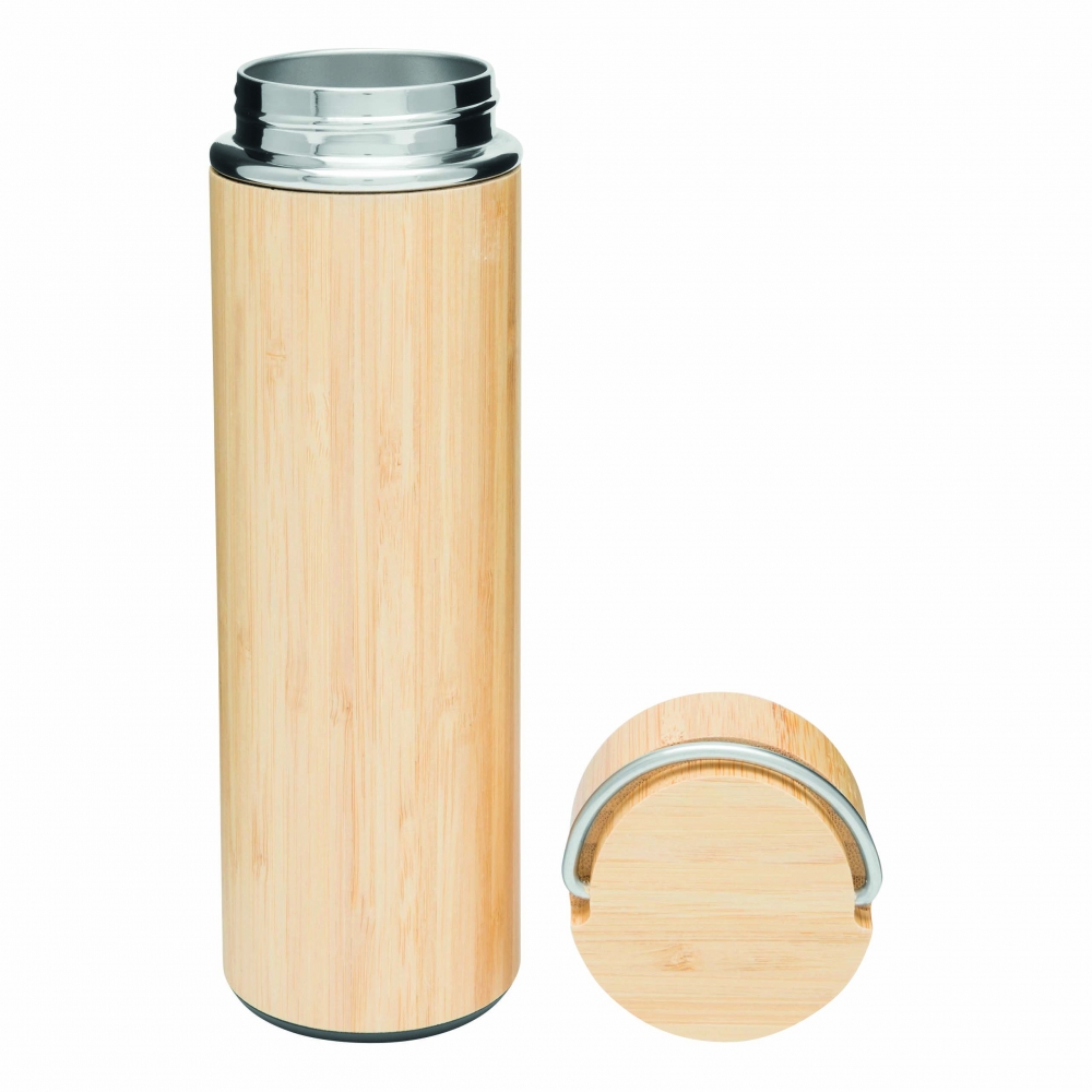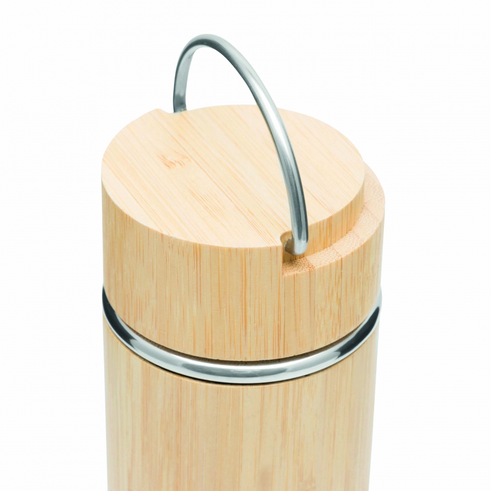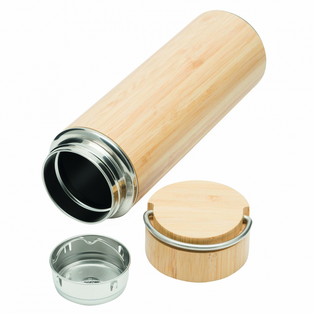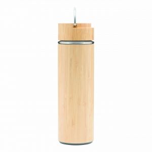 Artikel-Nr: INP56-0304572Vakuum-Isolierflasche BAMBOO HOT, doppelwandig: innen und außen aus Edelstahl, mit Bambus-Ummantelung, Deckel mit sicherem Schraubverschluss, Silikondichtung und Edelstahl-Tragegriff, mit herausnehmbarem Teesieb, Füllmenge ca. 400 ml