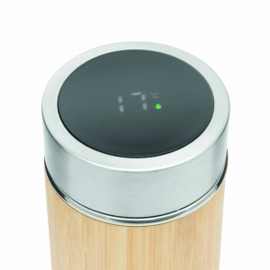 Artikel-Nr: INP56-0304573Vakuum-Isolierflasche BAMBOO TEMP, doppelwandig: innen und außen aus Edelstahl, mit Bambus-Ummantelung, Deckel mit sicherem Schraubverschluss, Silikondichtung und integriertem digitalen Thermometer, mit herausnehmbarem Teesieb, Füllmenge ca. 400 ml