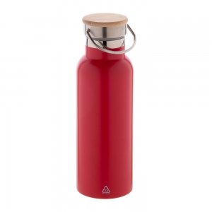 Artikel-Nr: AND808118-05Doppelwandige Vakuumflasche aus recyceltem Edelstahl mit Bambus-Tragedeckel. Füllmenge: 500 ml.
