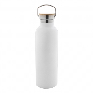 Artikel-Nr: AND808308-01Doppelwandige, vakuumisolierte Flasche aus recyceltem Edelstahl mit Tragedeckel aus Bambus. Füllmenge: 750 ml.