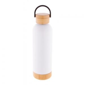 Artikel-Nr: AND808045-01Doppelwandige, vakuumisolierte Edelstahlflasche mit Tragedeckel und -boden aus Bambus. Füllmenge: 500 ml.