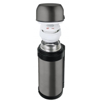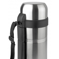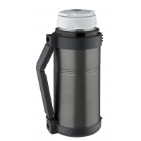 Weithals-Isolierflasche 1,5 l mit extra großer Öffnung, auch für Suppen und Eintöpfe, Quickstop Ausgießsystem, abschraubbarer Trinkbecher und zusätzlicher Kunststoffbecher, Klappgriff, abnehmbarer Tragegurt, Farbe Titan-Grau.