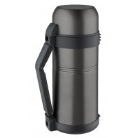 Weithals-Isolierflasche 1,5 l mit extra großer Öffnung, auch für Suppen und Eintöpfe, Quickstop Ausgießsystem, abschraubbarer Trinkbecher und zusätzlicher Kunststoffbecher, Klappgriff, abnehmbarer Tragegurt, Farbe Titan-Grau.