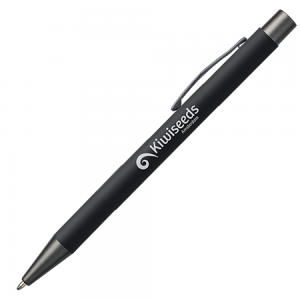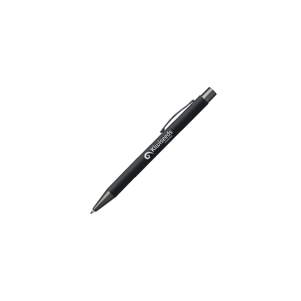 Artikel-Nr: PRM123018_15JAMAICA Metall-Kugelschreiber mit Rubber-Finish, Drucker, Clip und Spitze anthrazit, mit Lasergravur, blau schreibend
