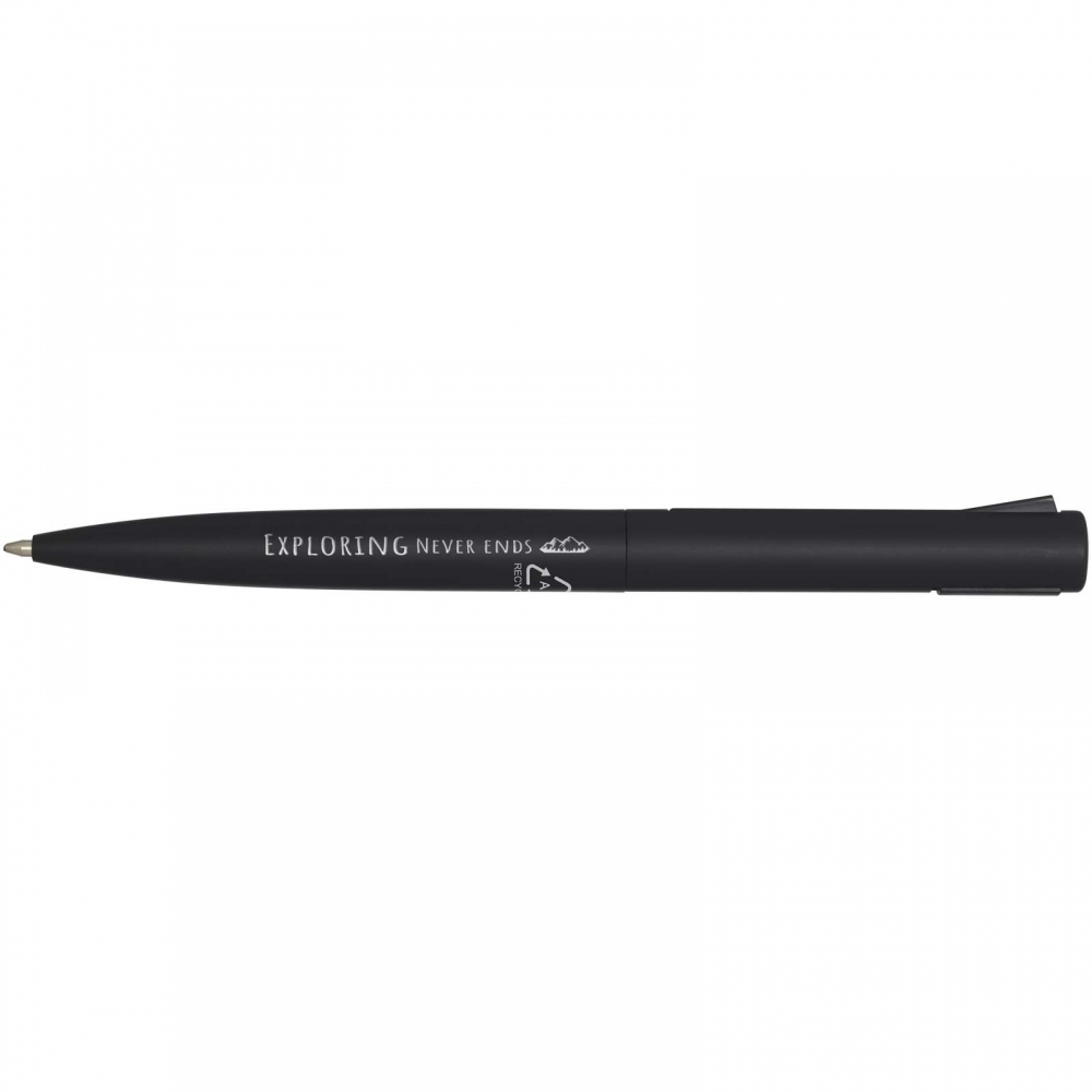 Artikel-Nr: CPO10791790Kugelschreiber, dessen oberer Schaft aus recyceltem Kunststoff und dessen unterer Teil aus recyceltem Aluminium besteht. Der Clip besteht aus Eisen. Tintenfarbe: Blau. Schreiblänge: 1000 Meter. Strichstärke: 1,0 mm.