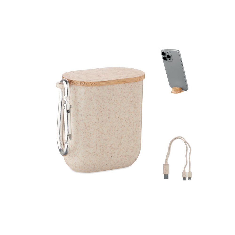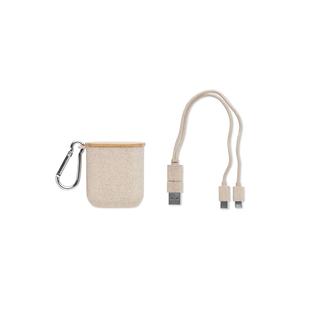 Artikel-Nr: OCBMO2921-13Kabel-Set in Box aus ABS / Weizenstroh mit Deckel aus Bambus mit Karabiner. Deckel mit Smartphone-Halter. Kabel-Eingang: 2in1 USB-C / A, Ausgang Typ-C und 2in1 Pin.