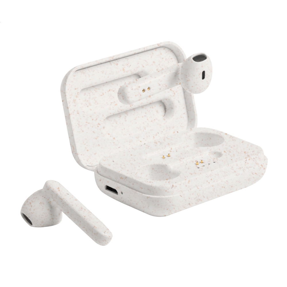 Artikel-Nr: AND721734-00Ökologischer Weizenstroh-Kunststoff, kabellose Stereo-Ohrhörer (TWS) mit Freisprechfunktion im Ladeetui. Inklusive USB-Ladekabel. In Kraftpapierbox.