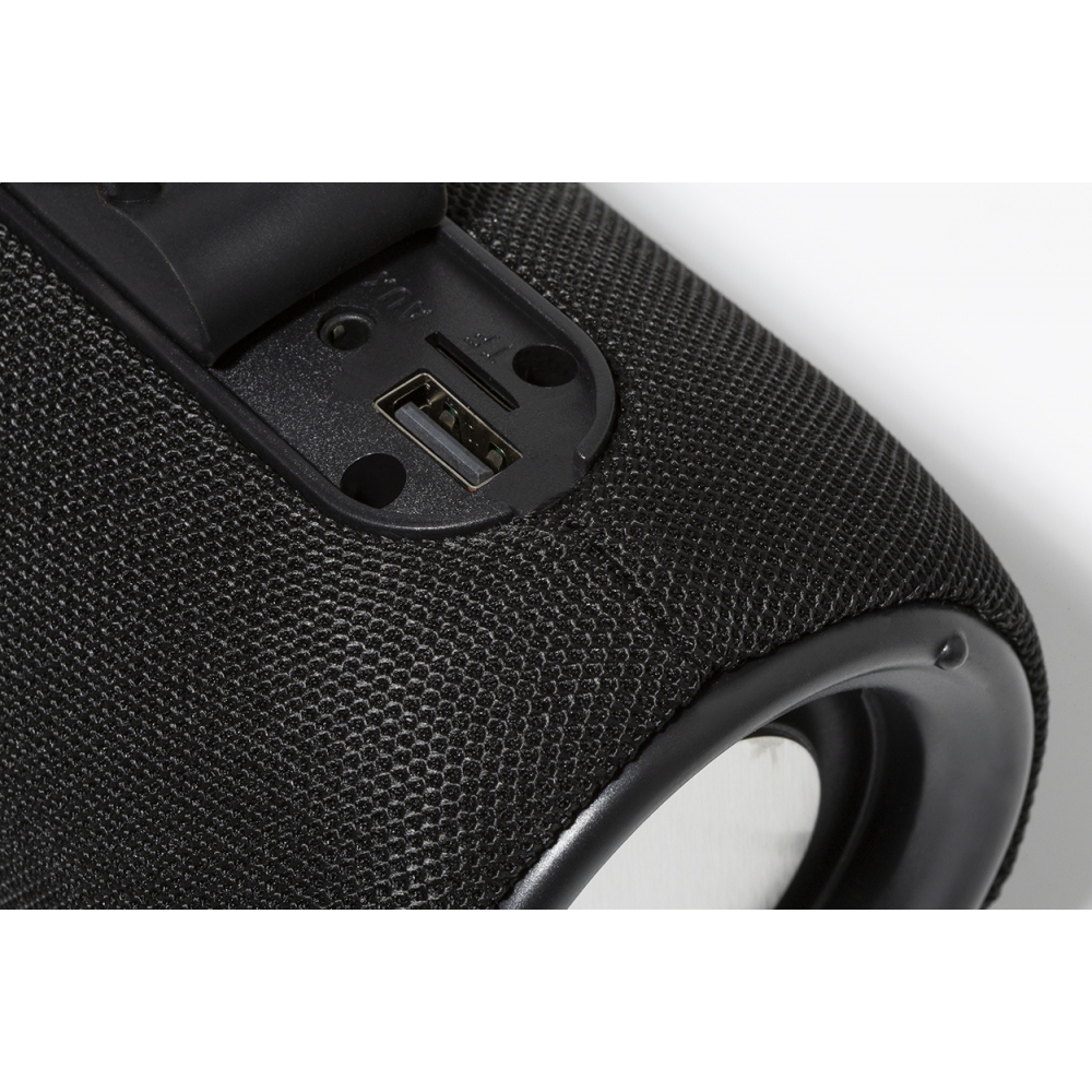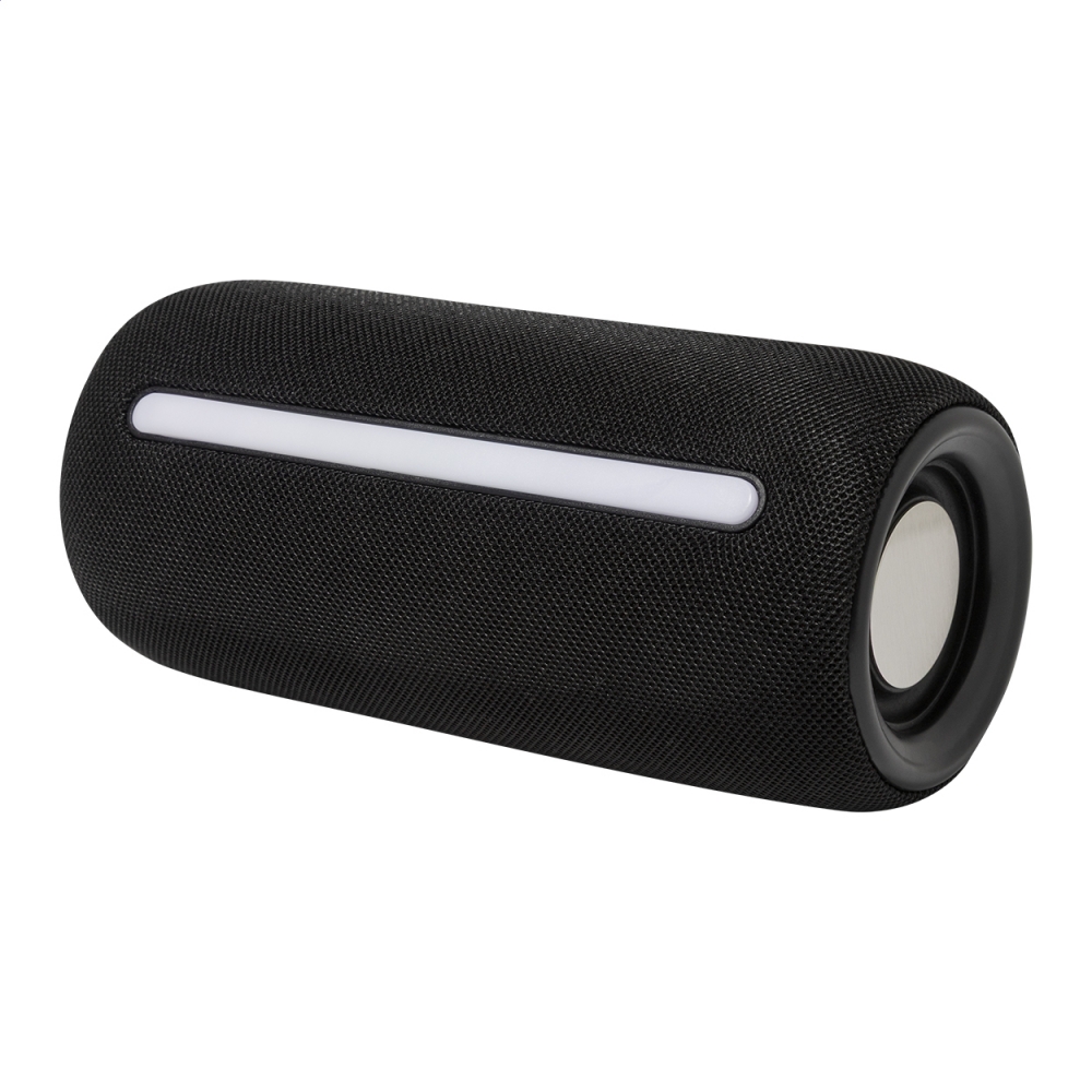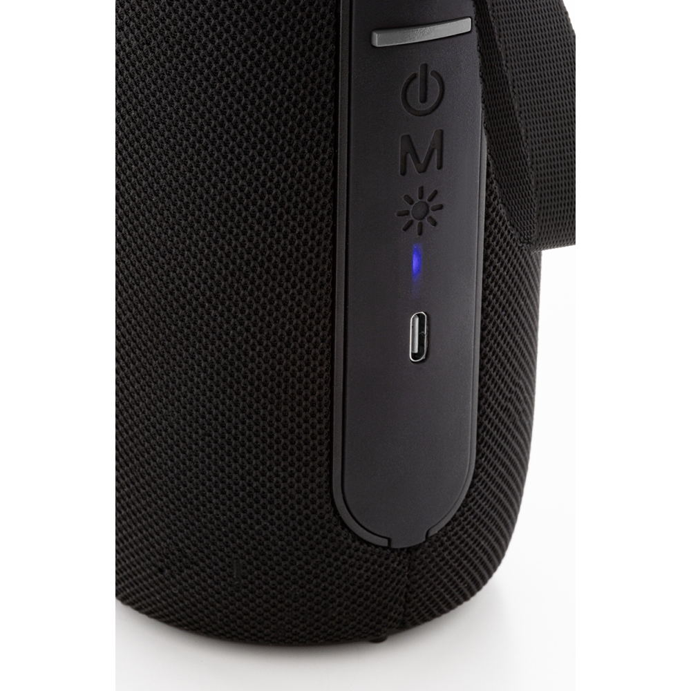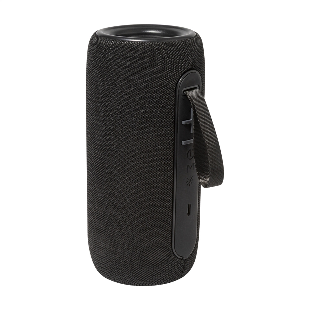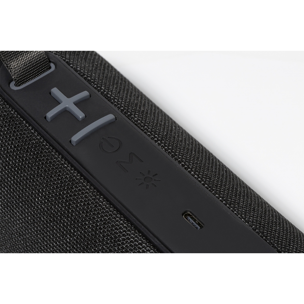 Artikel-Nr: AND864091-10Kabelloser Lautsprecher mit Polyester-Stoffbezug, mehrfarbigem LED-Licht und Tragegurt. Mit 2 Lautsprechertreibern, Freisprechfunktion und eingebautem Akku (1200 mAh). Inklusive USB-Ladekabel.