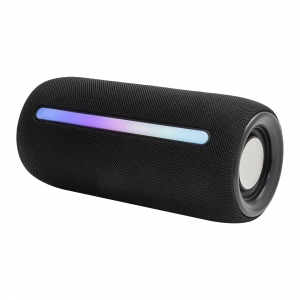 Artikel-Nr: AND864091-10Kabelloser Lautsprecher mit Polyester-Stoffbezug, mehrfarbigem LED-Licht und Tragegurt. Mit 2 Lautsprechertreibern, Freisprechfunktion und eingebautem Akku (1200 mAh). Inklusive USB-Ladekabel.