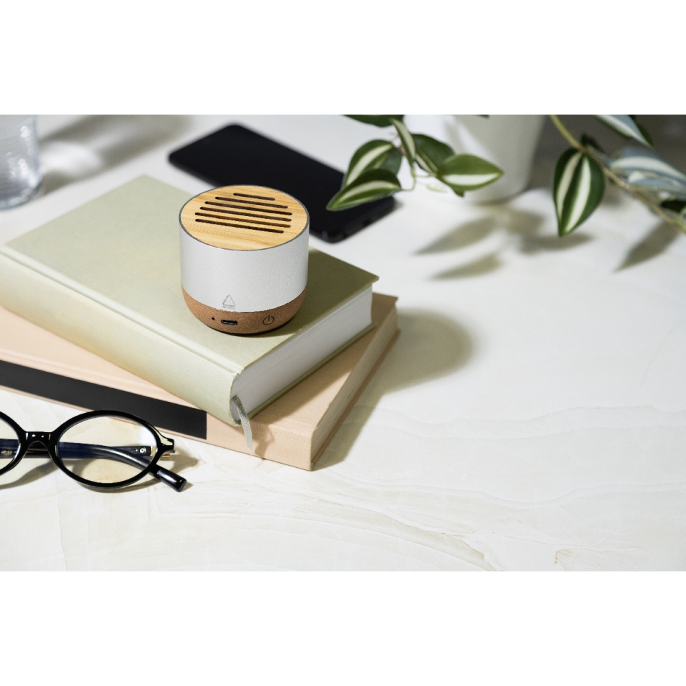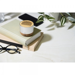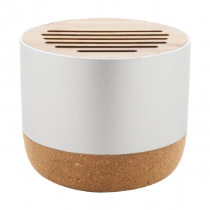 Artikel-Nr: AND864105-21Kabelloser Lautsprecher, Gehäuse aus recyceltem Aluminium mit Bambusgitter und Sockel aus Naturkork. Mit wiederaufladbarem Akku (400 mAh). Inklusive USB-Ladekabel.