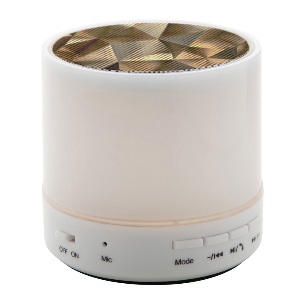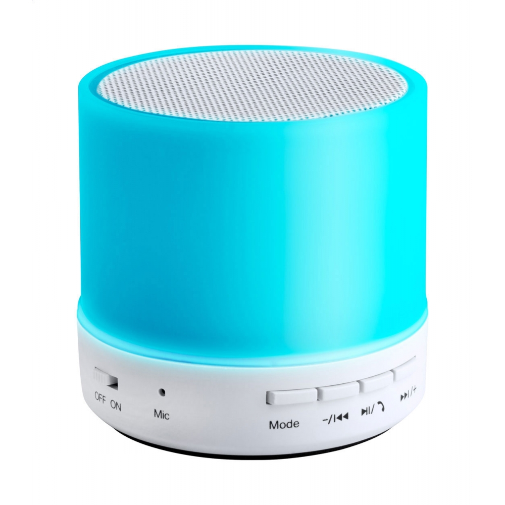 Artikel-Nr: AND721099-01Kabelloser Lautsprecher im Kunststoffgehäuse mit mehrfarbigem LED-Licht. Mit Freisprechfunktion, FM-Radio und eingebautem Akku. Inklusive USB-Ladekabel.