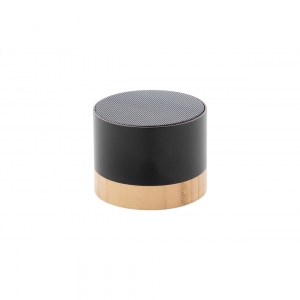 Artikel-Nr: AND864024-10Kabelloser Lautsprecher aus recyceltem Aluminium mit Bambusfuß. Mit Freisprechfunktion und integrierter wiederaufladbarer Batterie. Inklusive USB-Ladekabel.