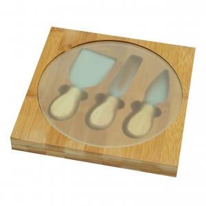 Artikel-Nr: INP56-0307052Käseset ORBITY, 4-teilig: bestehend aus Bambusbrett mit integrierter Glasplatte - unter der Schneidefläche befinden sich Hartkäsemesser, Parmesanbrecher und Serviergabel aus Edelstahl mit Holzgriffen, in Box
