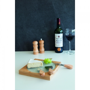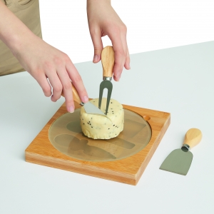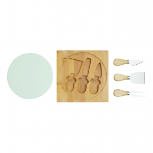 Artikel-Nr: INP56-0307052Käseset ORBITY, 4-teilig: bestehend aus Bambusbrett mit integrierter Glasplatte - unter der Schneidefläche befinden sich Hartkäsemesser, Parmesanbrecher und Serviergabel aus Edelstahl mit Holzgriffen, in Box
