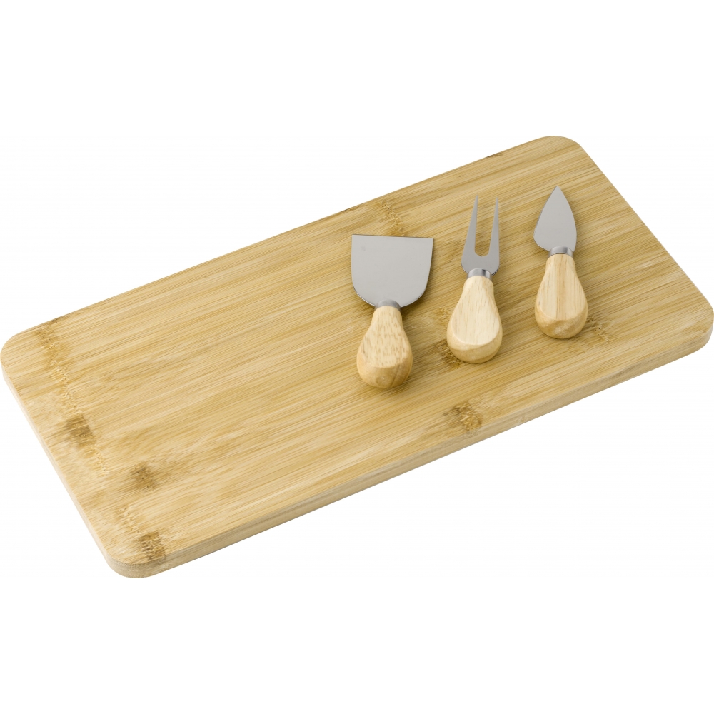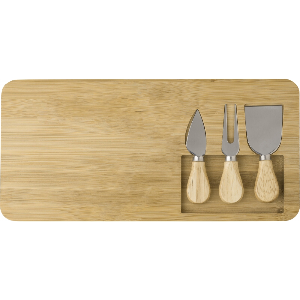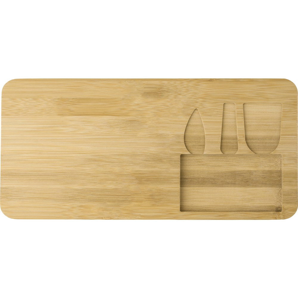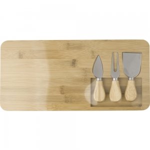Artikel-Nr: GIV709536011Käsebrett aus Bambus mit drei Utensilien, die in die Aussparungen des Käsebrettes passen. Einzeln verpackt in einer braunen Kartonage.