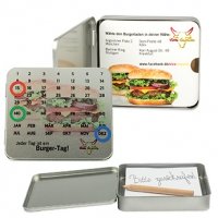 Artikel-Nr: 4011310080Der Dauerkalender für Ihren Schreibtisch! Mit den bunten Magnetringen sind Sie immer Up-to-date und für die Telefonnotizen liegen innen 100 weiße Zettel und ein kleiner Holzbleistift bei. Sollte Ihnen der Platz auf der Vorderseite der Dose nicht ausreichen, können Sie zusätzlich einen Einleger ebenfalls individuell und vierfarbig gestalten. Größe: 11,3 x 10,6 x 2 cm