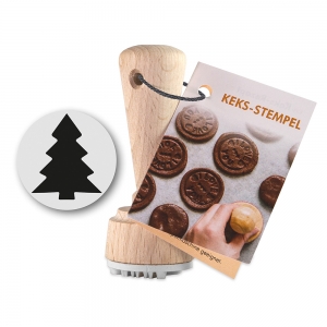 Keksstempel 35 mm mit Standardmotiv Tannenbaum und Standard-Werbekarte mit Rezept