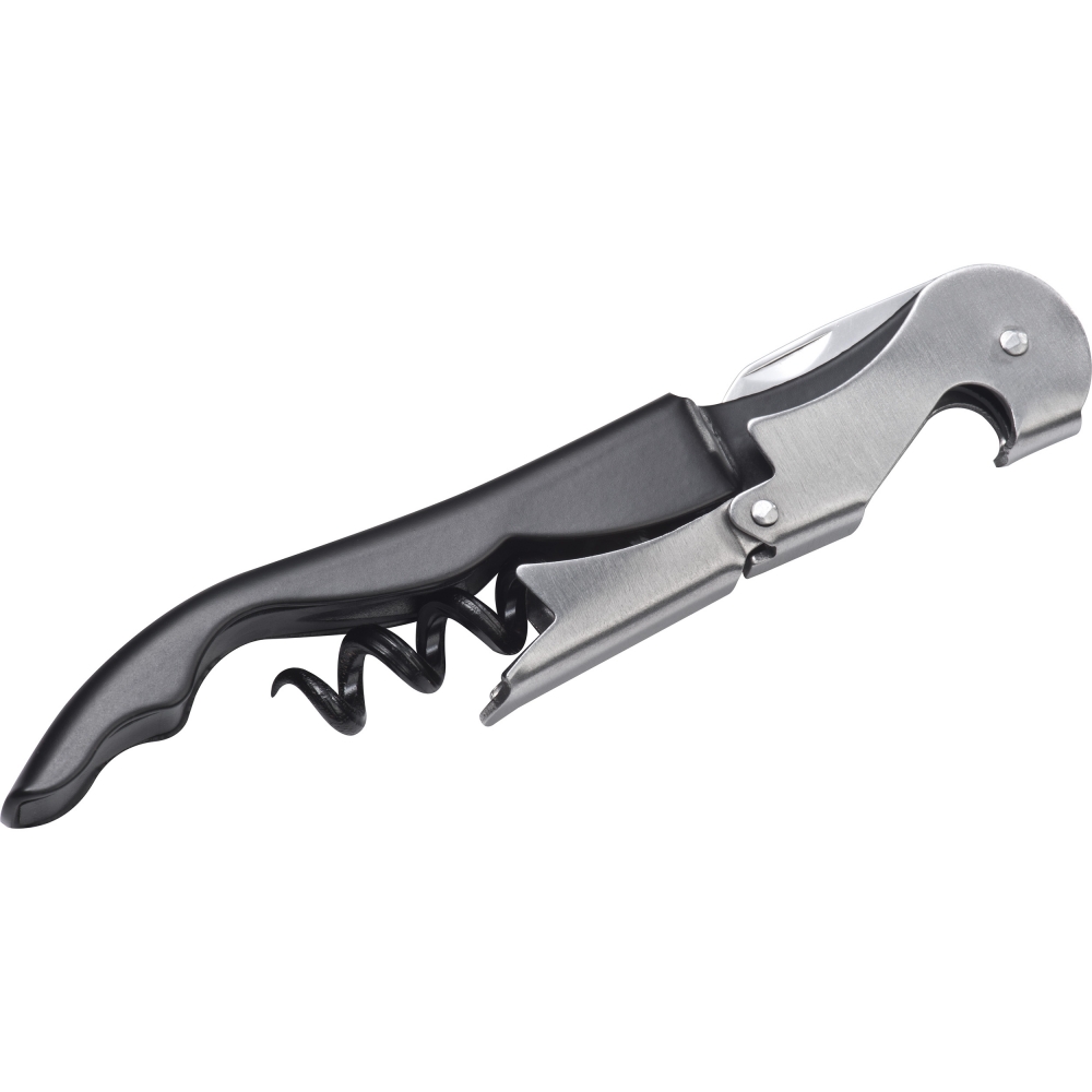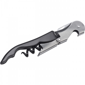 Artikel-Nr: MCM8286503Kellnermesser aus Metall mit Flaschenöffner, Folienschneider, sowie Korkenzieher mit 2 Hebestufen. Ihre Werbung wird auf die schwarze Fläche gelasert.