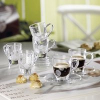 6 Espresso-Glastassen (7cl) mit extra dickem Eisboden mit ätzweißem Dekor, 6 Glas-Unterteller in witziger Taschenverpackung.